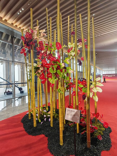 作品以各類火鶴為主花材,鋼竹作為花藝架構(gòu)。竹子,虛懷若谷,不動(dòng)如山。它彰顯了寧波企業(yè)家的特有氣質(zhì),寓意未來經(jīng)濟(jì)紅紅火火、欣欣向榮、節(jié)節(jié)攀登、前程似錦。